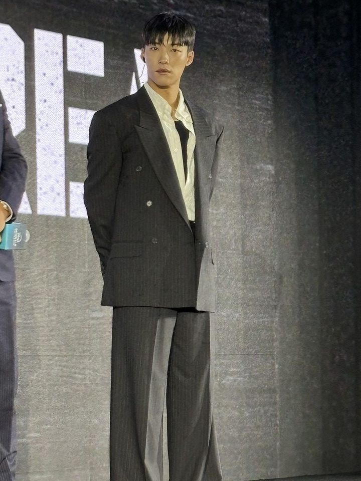 三種三様な着こなしが眼福だったスーツ姿で登場した、ヒョンビン、チョン・ウソン、ウ・ドファンの『メイド・イン・コリア』チーム。オーバーサイズなダブルのスーツにインナーを見せるようにシャツを着こなす、モードライクなスタイリングに身を包んだウ・ドファン。暇さえあれば、手を振ったりファンサービスをしてくれる優しさも。史実とフィクションがおり混じった本作。「(映画『インサイダーズ』や『ハルビン』など硬派な作品で知られる)ウ・ミンホ監督の作品が本当に好きで、一緒に作品を作ることに魅力を感じた。自分ならどうするか、自分を重ねながら観るのも楽しいと思う」鑑賞ポイントを提案! 本作はアクションシーンも見所の1つ。「拳をだすことだけがアクションシーンじゃないと思うんです。生き残るために走ったり・・・ スケールの大きい作品に仕上がっていると思います!」