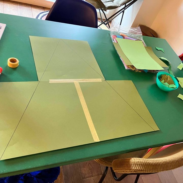 ちぎってもらっている間に土台を作っておきます。もちろんこの工程もお子さんと一緒にやってもOK!です。作りたい大きさに画用紙を三角に切っておきます。私たちは今回大きいのが作りたかったので画用紙をマスキングテープで簡単に3枚繋げて作りました。この時に一緒にツリーの枝の部分も作って貼っておきます。