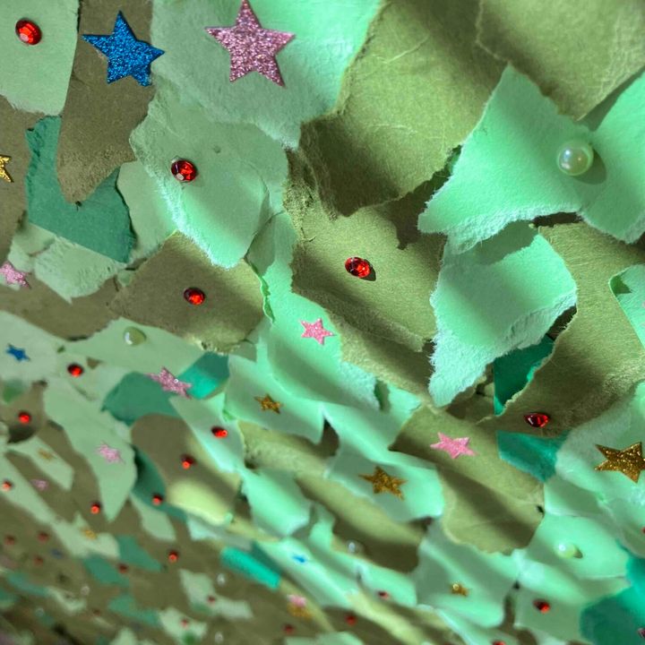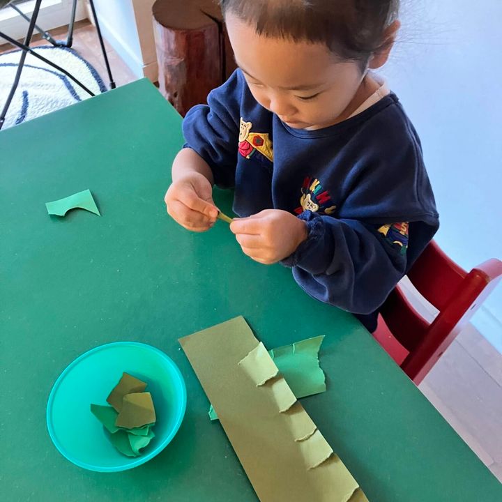 今年は色んなグリーンの画用紙を混ぜてちぎりまくる。どんな形になっても可愛いので何も考えずにビリビリ。ビリビリが難しい子は写真のように端っこに大人が切れ目を入れておいてあげると簡単にできるのでやってみてください。