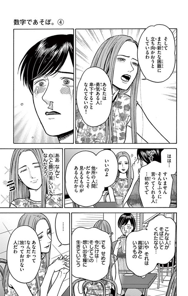 ある夏、突然幻のような美女と出会った大学4回生の横辺建己。数学の勉強に行き詰まり、卒業後の進路も不透明な横辺を、彼女は優しく慰め微笑んでくれた。あっという間に横辺は心を奪われてしまい…。甘い恋慕が呼び込むのは本当に幸福なのか? 理系学生がこの世にあふれた数字を語る漫画『数字であそぼ』より、必見の第21話をお届け!