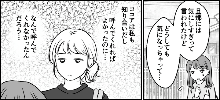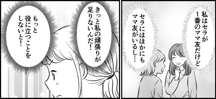 「どうしたの~? 悩みごと? 元気ないじゃん」私はセラに声をかけました。セラとは学生の頃からの付き合いです。学生の頃はグループが違ったので一緒に遊ぶことはありませんでしたが、偶然子ども同士が同い年で再会して、ママ友になりました。