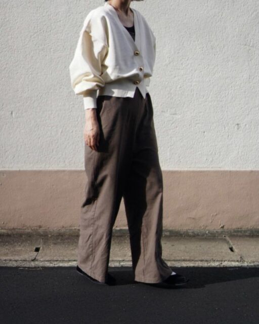 旬のワイドパンツと相性がいいのは短め丈の白ニットカーディガン。さらにキラリと輝くゴールドボタンが華やかさを添えてくれます。