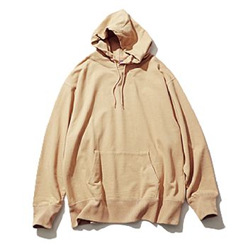 直球でカジュアルなビッグフーディは、甘さが残る色でテイストをあいまいに。メンズならではのボリューム感とすそまですとんと落ちる長め丈で、どんな形のボトムも受けとめられる。 ベージュビッグフーディ(メンズ) /GOAT(トウキョウデザインベース)