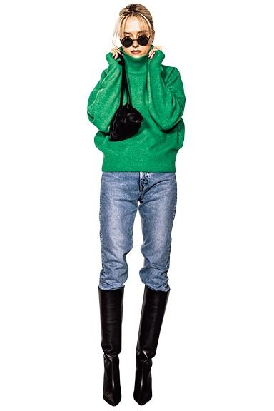 辛口デニムに甘い色だとミスマッチで、攻めた色だとちょっと強すぎる。そんなときに、そのどちらともいえない深みのあるグリーンが意外にも最適なパートナー。黒のレザー小物がアクセントカラー兼引き締め役に。