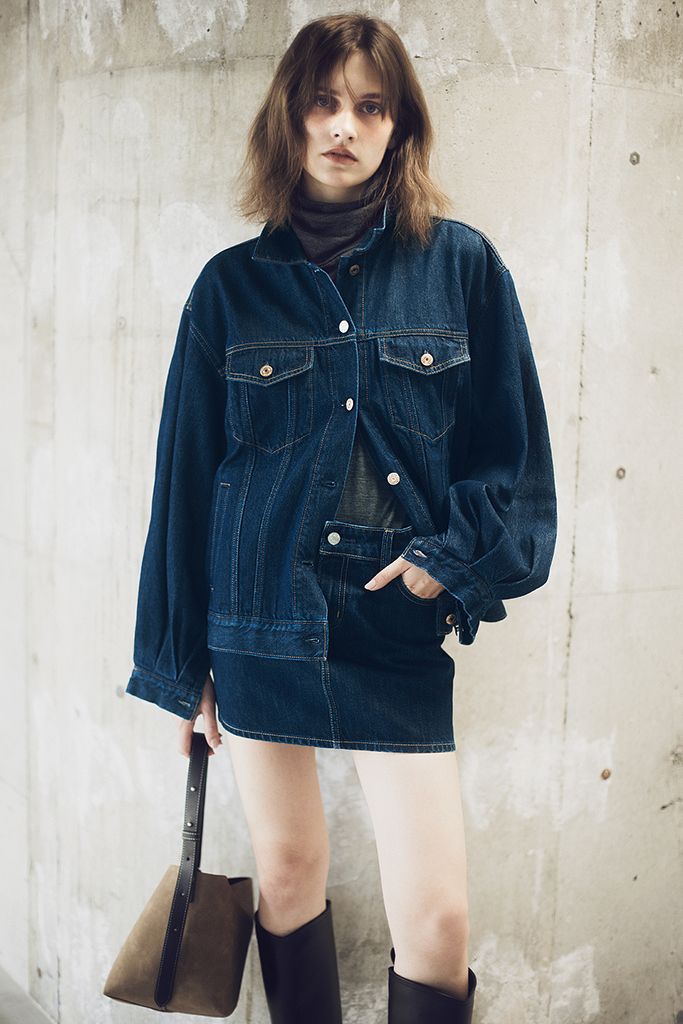 目立たせるよりもなじませるように上下そろえれば、ミニに対するハードルも下がる。デニムといえど気張って見えがちなセットアップも、ミニのおかげでカジュアルダウンが図れるという、うれしい相乗効果を期待。どちらもハリを感じさせないくたっとした風合い。黒のロングブーツで、気になる肌感をセーブ。
