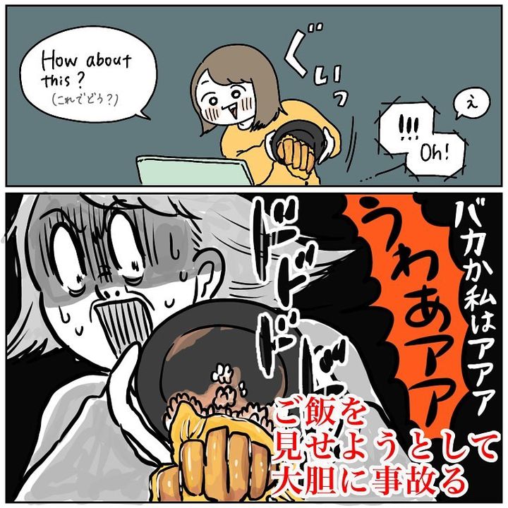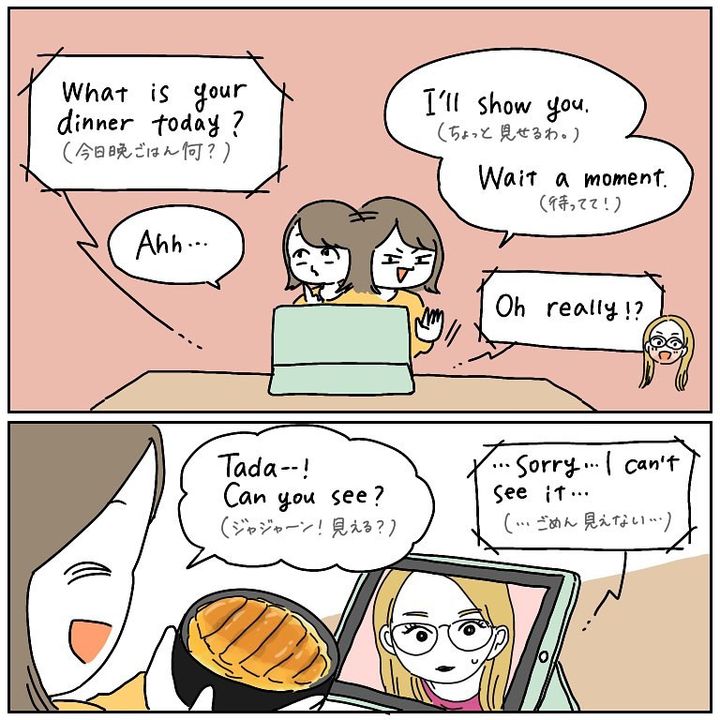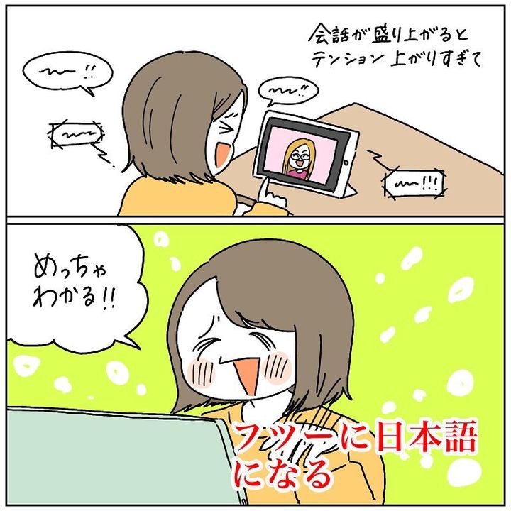 こんにちは!Instagramで日々の暮らしを漫画で紹介している、Web漫画家のmomoです。1年前からオンライン英会話を習っているわたし。当然、もうペラペラに話せるようになってる…ワケもなく(泣)。英語を話しているつもりが、逆ルー大柴(?)になってしまったり、いつのまにか純日本人に戻ってたり、しまいには重力の存在すら忘れてしまい…!?どういうことか、漫画をご覧あれ〜。