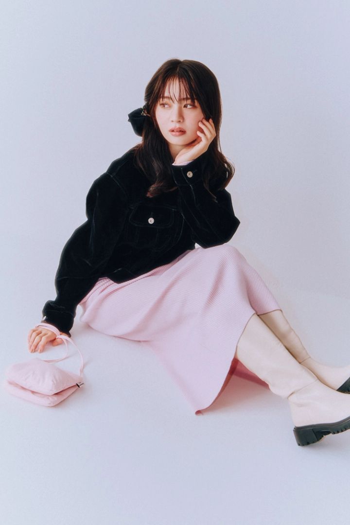 黒ベロアジャケット 29,480円/MOUSSY、ピンクポロニットワンピース 8,250円/rienda(ともにバロックジャパンリミテッド)バレッタ 2,530円/GOLDY バッグ 9,780円/mucu andebony(HANA KOREA)ロングブーツ 19,910円/RANDA