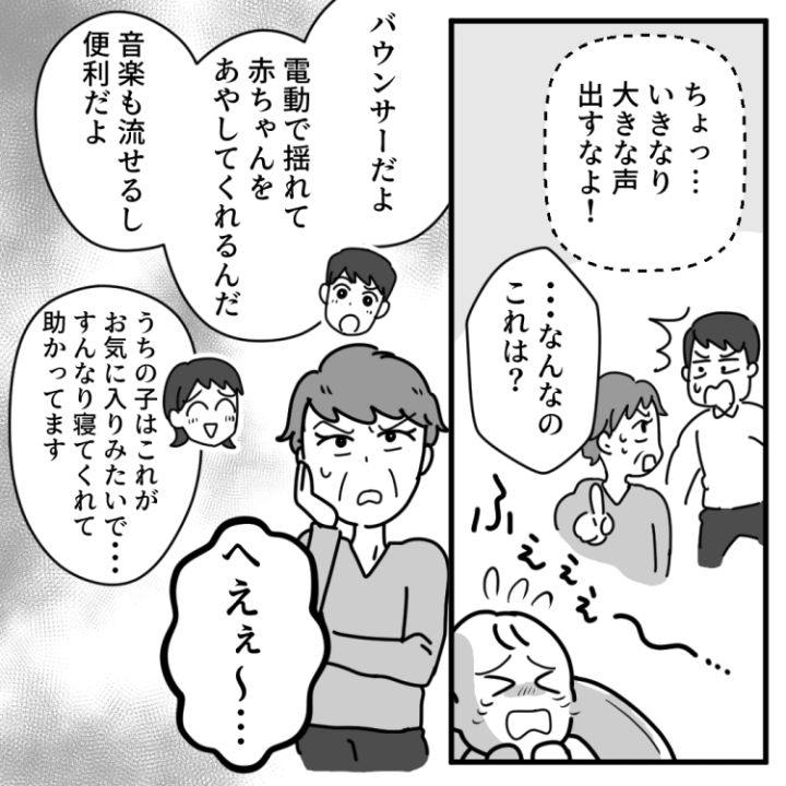 加奈は息子を出産したばかりだが、夫の仕事が多忙なため、毎日ワンオペで家事・育児をこなしている。なるべく負担を減らすため使えるものは使う主義なので、電動バウンサーや食洗機、ロボット掃除機などをフル活用していた。そんなある日、孫の顔を見に加奈たちのところへやってきた義母。しかし、バウンサーで寝ている孫を見て、なんと義母が衝撃的な発言をすることに!?
