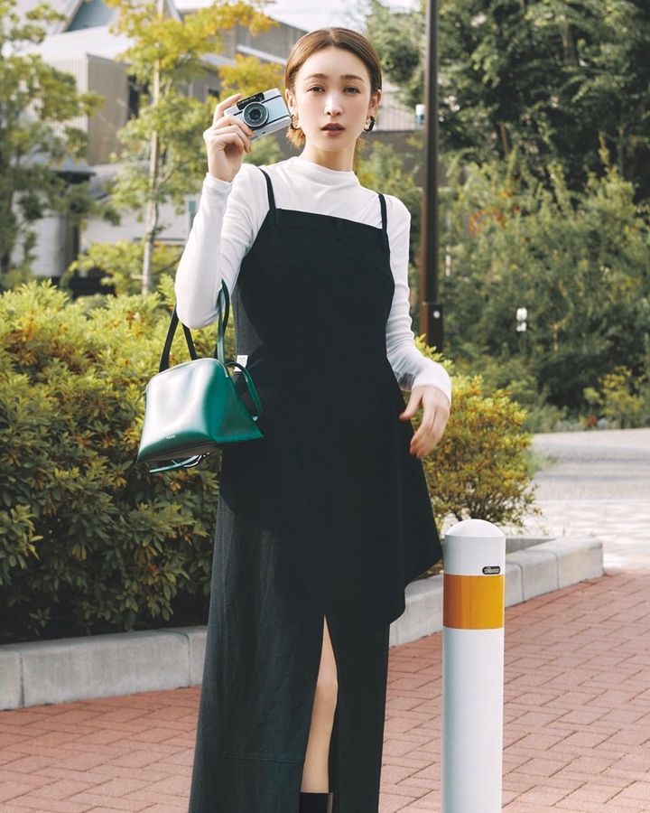 11月29日(土)、 首元をすっきり見せてくれる白のハイネックトップスに、変形シルエットの黒キャミワンピを重ねたシンプルレイヤード。モノトーンの組み合わせでも立体感が出て、ぐっとスタイル良く、ミニマルなのにおしゃれに決まります。差し色には、ビンテージライクなグリーンのバッグをオン。深みのある色がフレンチシックなムードを添えて、全体の印象をさりげなく格上げしてくれる一日コーデに。