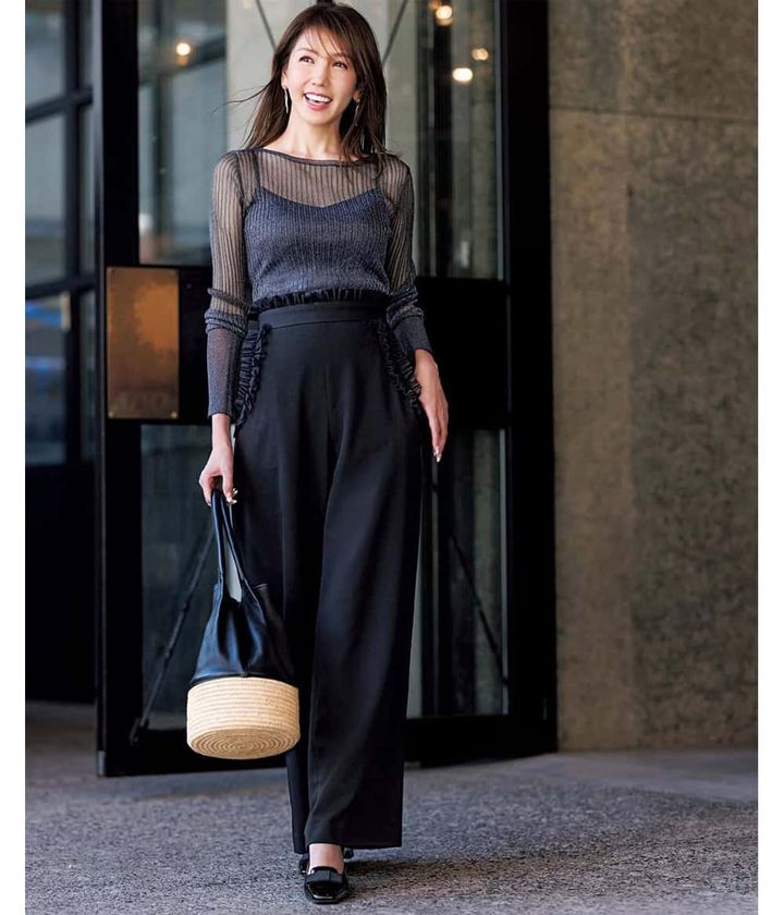 何かとイベントが増えるこれからのシーズン。無理せず華やぎたい時、やっぱり頼れるのは黒コーデ!ウエストとポケットにチュールフリルをあしらった黒パンツなら気負いなく取り入れられて瞬時にドラマティック♡ 長袖シアートップスで品よく“肌感”を演出すれば、やりすぎない大人のドレスアップが即完成。