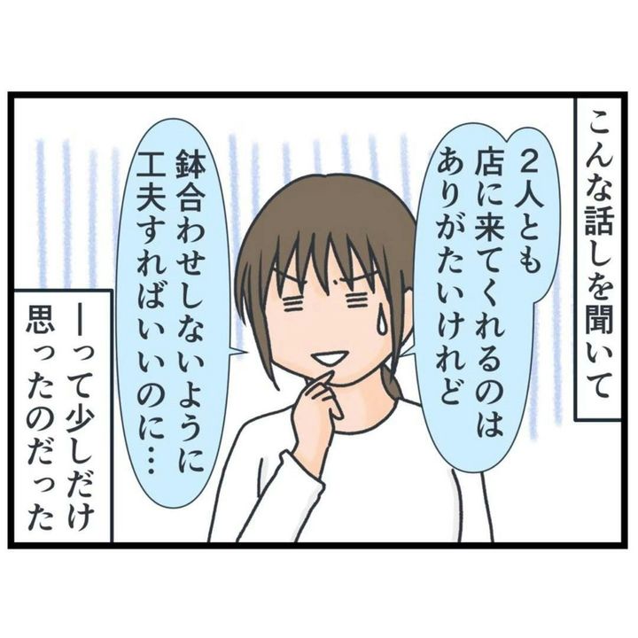ナエくまさんが言うように「来店時間をズラせばお互い会わなくて済むのに」という感じですが、ここでどちらかが引き下がっては「相手に負けた」と感じ、意地もあって同じ時間に来店し続けたのかもしれませんね。