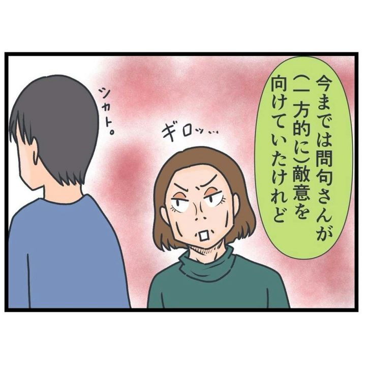 問句さんの態度に耐えかねてついにブチ切れた青い服の女性。これまでは一方的に受けていた嫌がらせに対し、報復するようになってとのこと…。