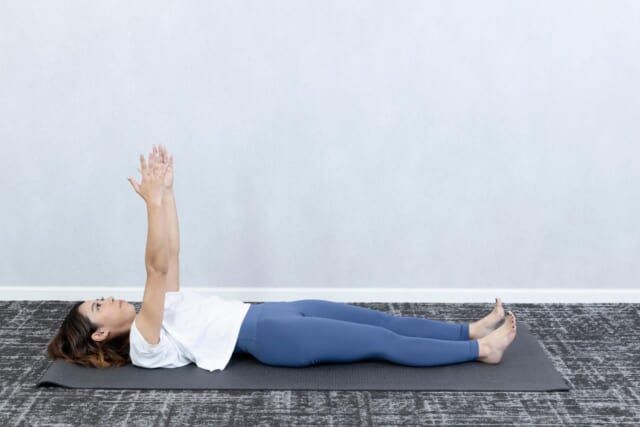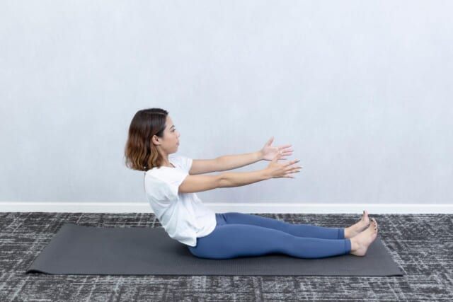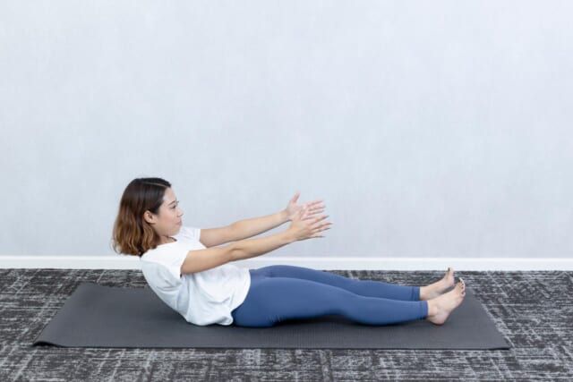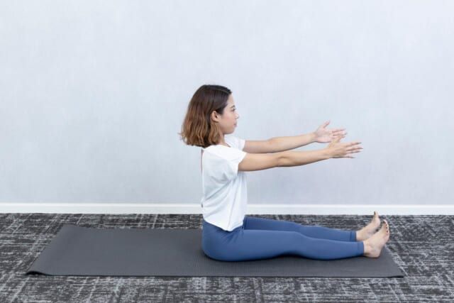 5回を目安に背骨の動きがスムーズになるまで繰り返し行います。なお、期待する効果をきちんと得るためには「肩の位置を上げないこと」「背中を一気に倒さないこと」「両脚を床から浮かさないこと」の3つがポイント。背骨周りのこわばりがほぐれると、正しい姿勢をキープしやすくなりますし、代謝も自然と上がっていきますよ。<ピラティス監修:Minami(トレーナー歴4年)>