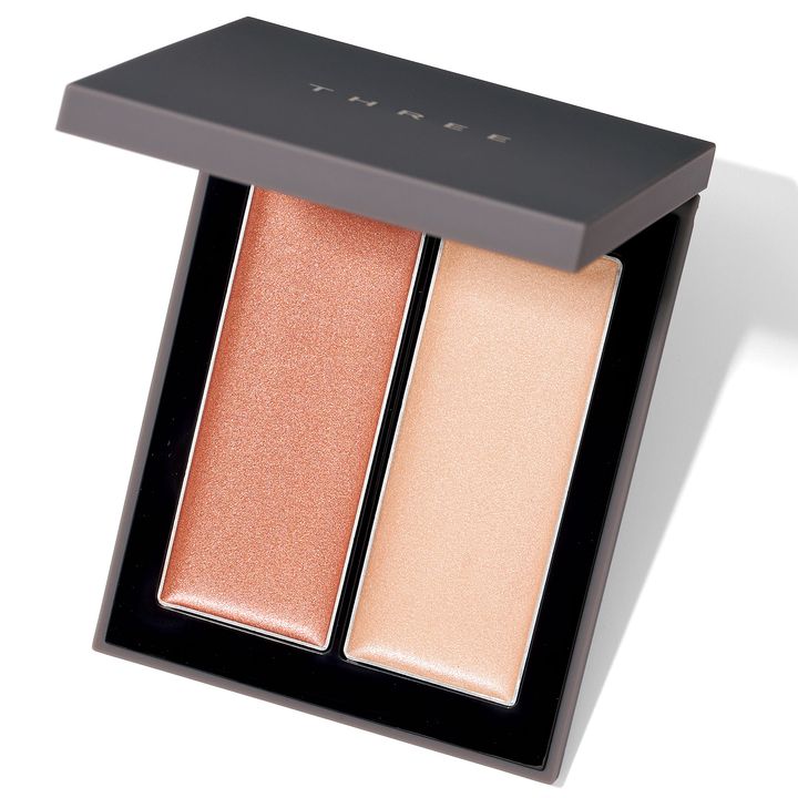 肌を健康的に見せる血色カラーと骨格を引き立たせるハイライトのセット。うるんだようなツヤ感が叶うクリームトゥパウダー。THREE シマリング グローデュオ R 01 ¥4,950(THREE)