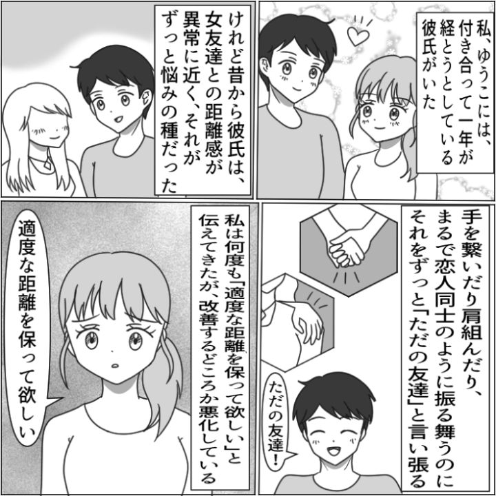 主人公には付き合って1年になる彼氏がいます。しかし、この彼氏、昔から女性との距離がおかしく散々悩まされてきた主人公・・・。