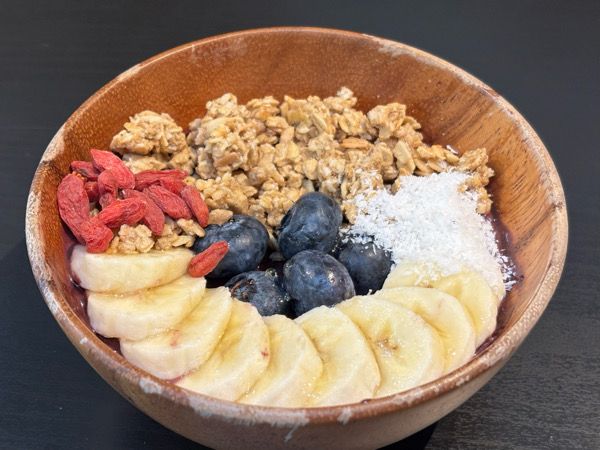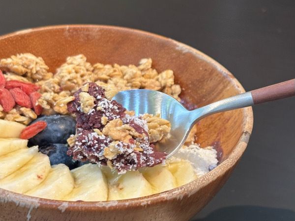 アサイーの上にバナナ、大粒のブルーベリーとフレッシュな果物がたっぷりです。 一口食べてみると...美味しい!濃厚なアサイーにアガベシロップとフルーツの優しい甘さがピッタリ。ザクザクッとした食感の有機グラノーラがトッピングされているので、食べ応えもありました。