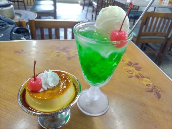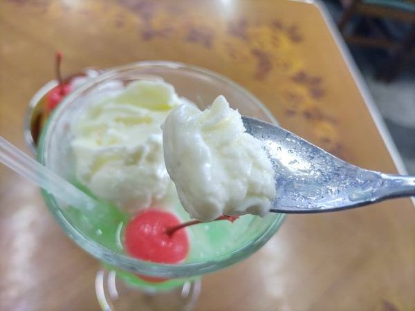 鮮やかなグリーンとアイスがのったクリームソーダは、レトロな店内でいただく時代を超えた「エモい」体験を演出してくれます。