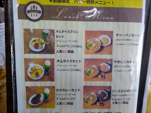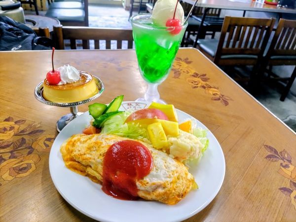 メニューは単品からセットメニューまで豊富に揃っていますが、特におすすめはランチセットメニューです。 中でも人気なのが、看板メニューのオムライスに『プリンとクリームソーダ』が付く「オムライスプリンセット」。
