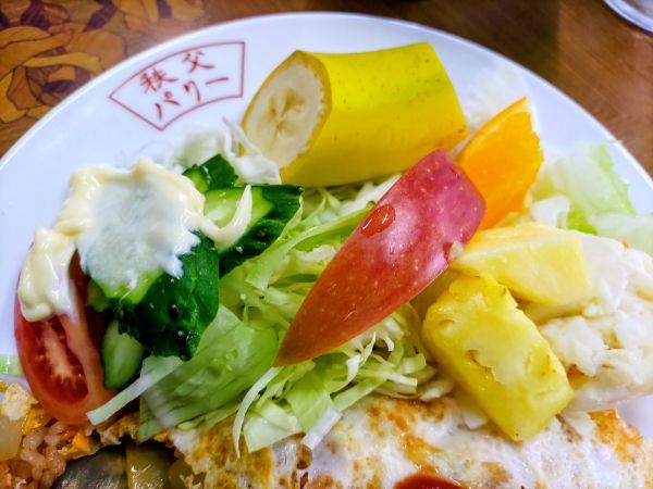 パリー食堂のオムライスには、フルーツや野菜が色鮮やかにプレートを彩り、 まるで大人になった今も楽しめる「お子様ランチ」のような心躍るワクワク感があり!