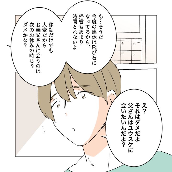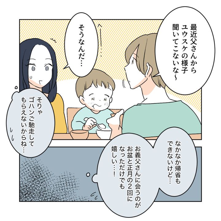 「最近父さんからユウスケの様子聞いてこないな~」ショウタの言葉に、「へー・・そうなんだ・・」と答えつつ、「そりゃゴハンご馳走してもらえないからね・・」と思う私。「なかなか帰省もできないけど・・お義父さんに会うのがお盆と正月の2回になっただけでも嬉しい・・!」と大喜びでした。