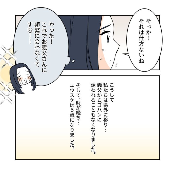 頻繁に義父が遊びに来ていた頃、食事代をショウタさんにたかっているだけだと思っていたマミさん。その後、ショウタさんが県外に転勤になり、義父に頻繁に会わなくて済むと大喜びしていました。そしてユウスケくんが5歳になった頃、義父がユウスケくんの様子を聞いてこないと言い出したショウタさんに、義父に会うのは次のお休みにしようと提案するも、ショウタさんに却下されてしまったマミさん、義父の行動にモヤモヤするのはわかっていても、ショウタさんに理解してもらうのはまだまだ難しそうですよね。