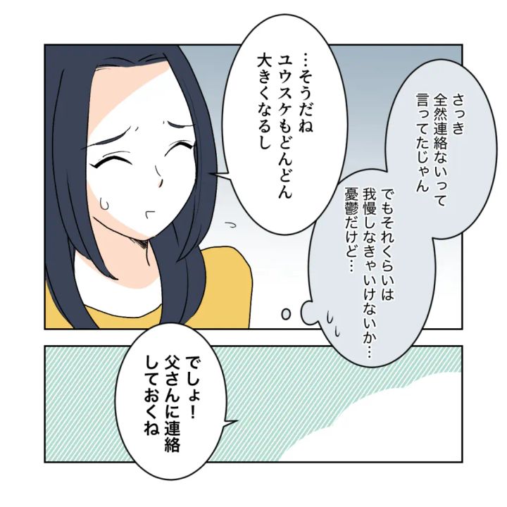 「さっき全然連絡ないって言ってたじゃん。でもそれくらいは我慢しなきゃいけないか・・憂鬱だけど・・」心の中でそう思いながら、「・・そうだね。ユウスケもどんどん大きくなるし」と答えると、「でしょ!父さんに連絡しておくね」ショウタが嬉しそうに言いました。