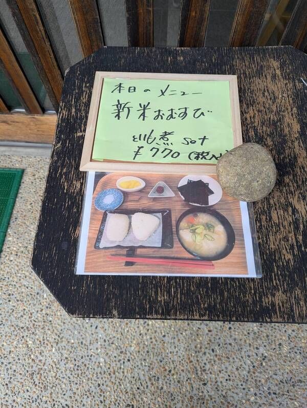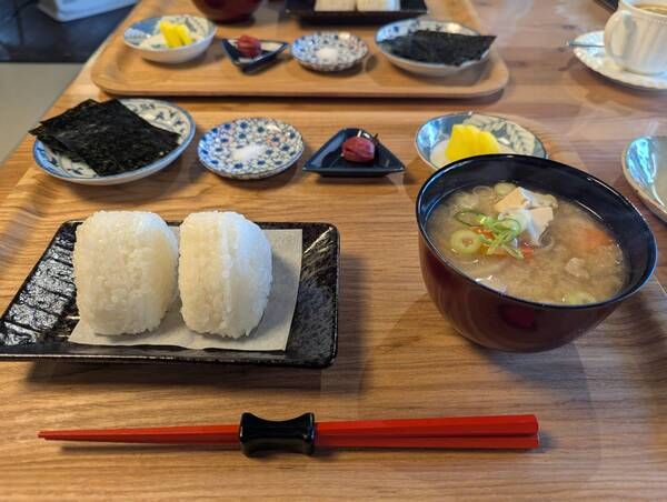 郡山市西田町産のとれたて新米のおむすびと、郡山産の新鮮野菜と