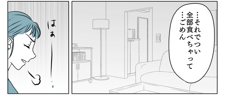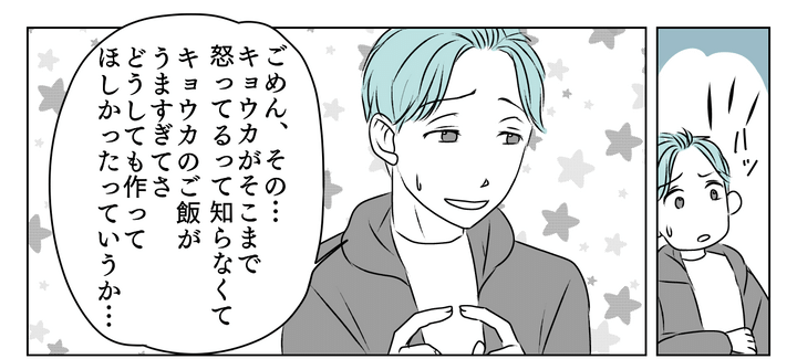 私の怒涛の言葉に、夫は言い訳を始めました。「キョウカの飯がうますぎて」と的外れな謝罪、心底呆れます。