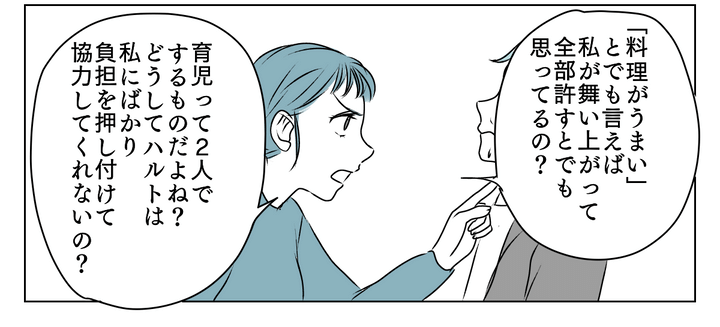 育児は2人でするものなのに、なぜ協力してくれないのかと問うと「料理ができない」と言い出す始末です。コンビニや惣菜の存在を指摘し、「無駄遣い」と言う夫の言葉を突き返してやりました。