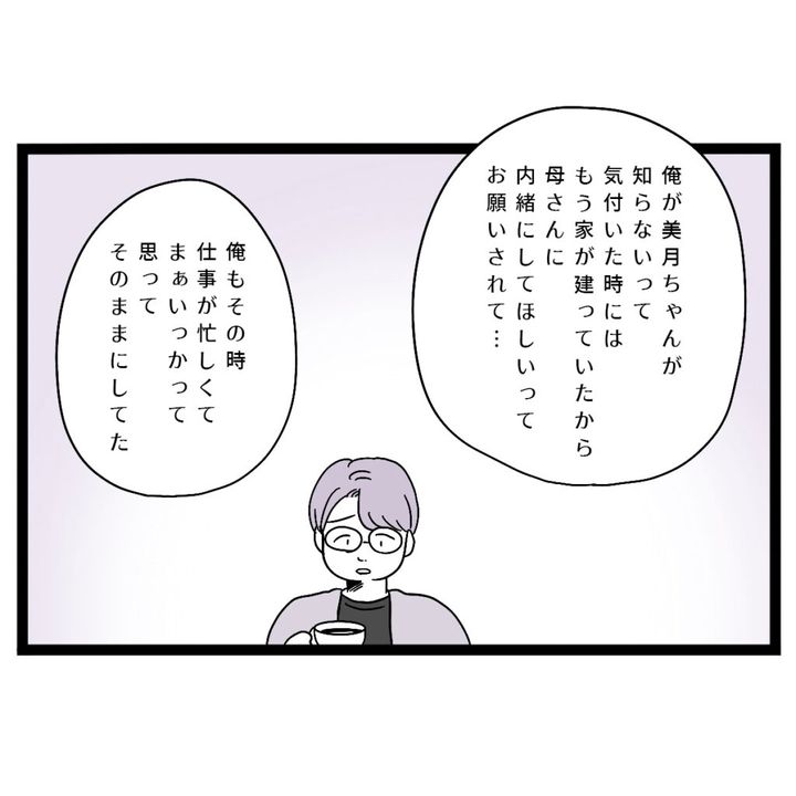 「俺が美月ちゃんが知らないって気づいた時にはもう家が建っていたから、母さんに内緒にしてほしいってお願いされて・・。俺もその時仕事が忙しくてまぁいっかって思ってそのままにしてた」申し訳なさそうに言うお義兄さんは、