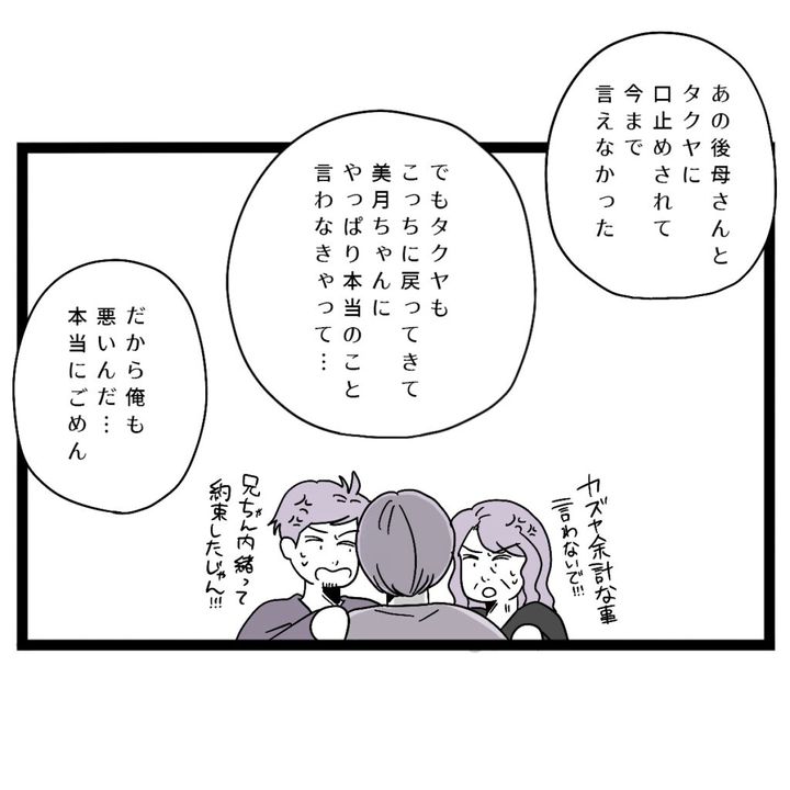 そして、「あの後母さんとタクヤに口止めされて今まで言えなかった。でも、タクヤもこっちに戻って来て美月ちゃんにやっぱり本当のこと言わなきゃって・・だから俺も悪いんだ・・本当にごめん」と謝るお義兄さんに、