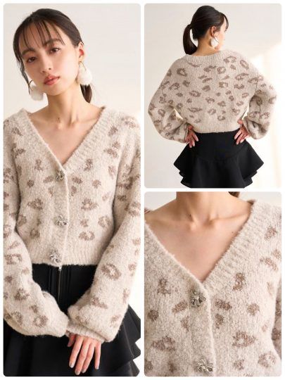 キラキラと輝きを放つラメ入りニットカーディガンは、ホリデーシーズンの気分をあげるのに必須♡無地のアイボリーとネイビーのほか、ちょっと辛口なレオパード柄を展開しています。ボタンをすべて閉じてトップス感覚で着こなすのも◎!