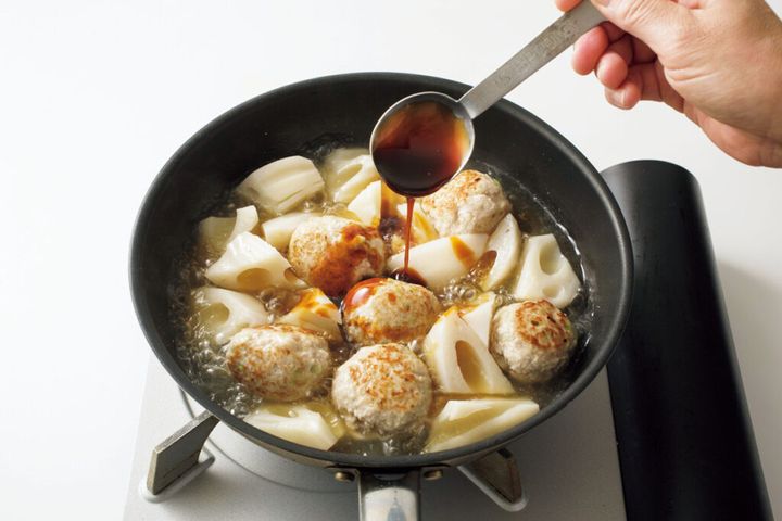 直径24cmのフライパンにサラダ油を中火で熱し、肉だんごを並べ入れる。ころがしながら焼きつけ、かるく焼き色がついたられんこんを加えてさっと炒める。酒をふり、水1カップを加えて煮立て、オイスターソース、しょうゆを加えて混ぜ、ふたをして10分ほど煮る。