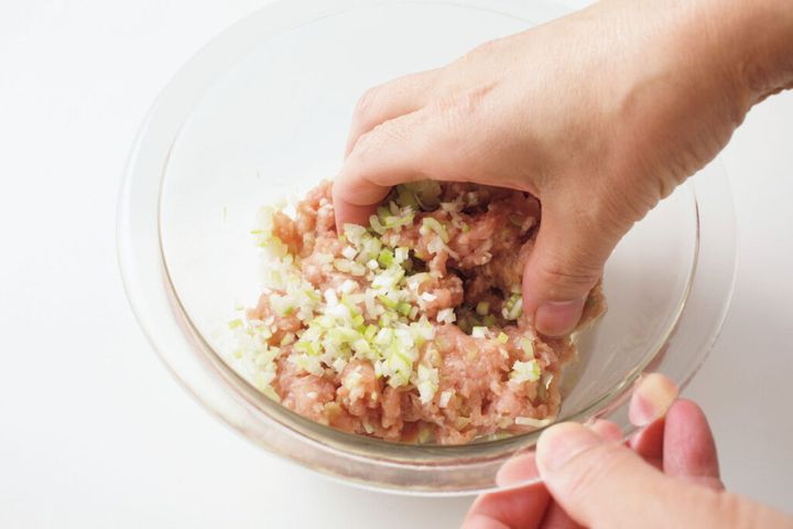 たねは粘りが出るまで練り混ぜることで、焼いたときに肉だんごが割れにくくなります。なお、脂身の少ない赤身のひき肉を使ったほうが、しっかりとした食べごたえをキープできます。