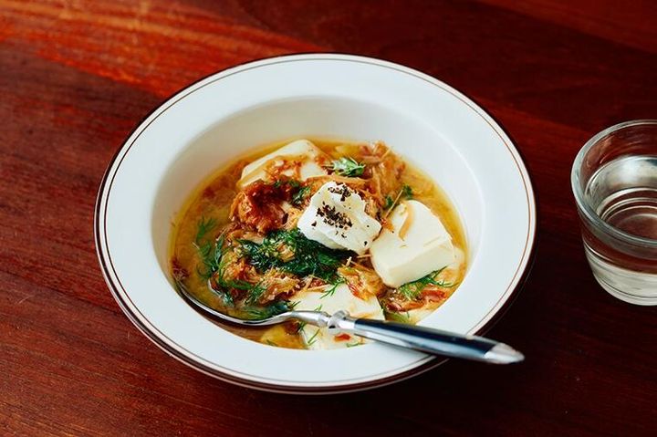 ボルシチはカレイの縁側缶を水で煮込む。こうすることで、レトルト臭が飛んでカレイの旨味と煮汁の旨味がよみがえる。具には豆腐を加え、カレイの旨味をしっかり吸わせる。この段階で味見をすると、甘辛い煮汁がぷるぷるの豆腐にしみ込んで、白飯を欲するような一品になっていた。これだけで十分美味しいのに、なぜボルシチに?
