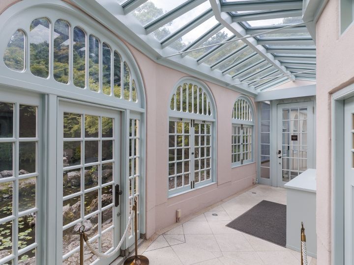 池の東側にあるこちらの通路は新棟、「夢の箱」(山手館)へと続きます。加賀氏は蘭の栽培を生涯の趣味としており、かつてはこの通路の先には蘭を育成するための温室がありました。天井や側面に大きなガラスが配されたこちらの通路はアールを描いた窓が明るく柔らかな雰囲気を醸し出します。