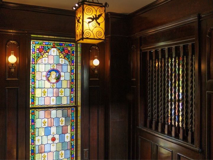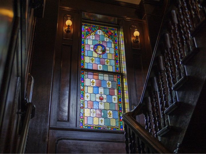続いて2階へと進みます。まずは優美な手すりが印象的な中央階段へ。やはり目を引くのが、ヨーロッパから取り寄せたというステンドグラス。なんとこの山荘の設計段階から現在の位置に置くことが想定されていたそうで、光を浴びてきらめく姿は何とも神々しい光景です。