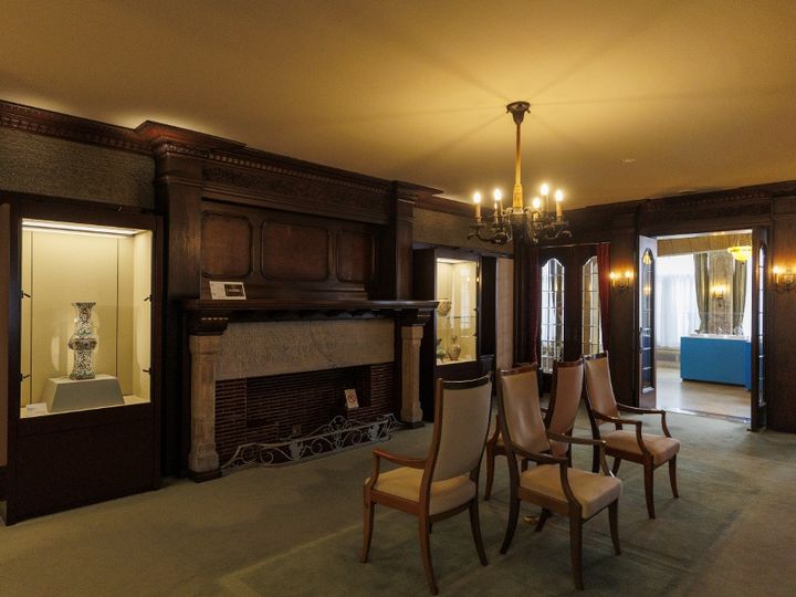 山荘の1階でぜひじっくりと見学したいのが、加賀氏がくつろいでいた旧居間(現山本記念展示室)。現在は、民藝運動に熱心だった山本爲三郎氏のコレクションが展示されていますが、注目すべきポイントは、加賀氏が細部にわたってこだわり抜いた意匠です。