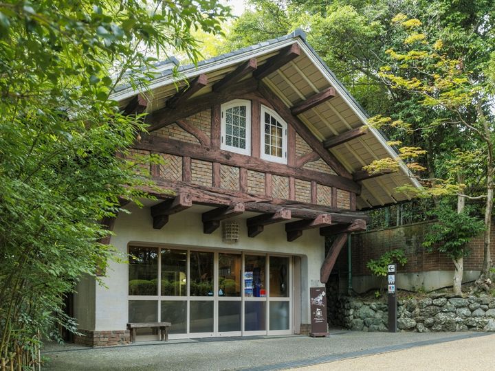 かつて車庫として使われていたレストハウス(無料休憩所)も、国の登録有形文化財。チューダー・ゴシック様式の建物の内部には、当時のガレージの扉やピットの跡が残されています。美術館には大きなかばんの持ち込みができないので、こちらの無料コインロッカーに預けましょう。