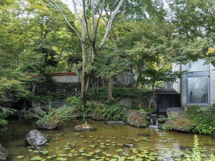 山荘本館の斜面下に広がる庭園もぜひ散策したいところ。春の桜や秋の紅葉などが美しく、園内の池でも初夏には睡蓮の花を楽しめます。加賀氏が住んでいた時代も、こちらの池には睡蓮が植栽されていたそう。安藤建築も顔をのぞかせる美しい空間は、写真撮影におすすめです。