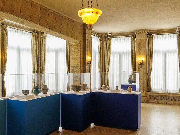 居間の隣は明るい空間が広がります。こちらの旧応接室には石の壁に龍山石を、床や窓の下の部分には大理石を用い、まるで宮殿のような趣です。この部屋には、世界遺産のパルミラ遺跡から発掘された「パルミラ饗宴図浮彫」(制作時期2-3世紀)が常設展示。当時の人々の暮らしがうかがえる貴重な遺物を、大山崎で鑑賞できます。
