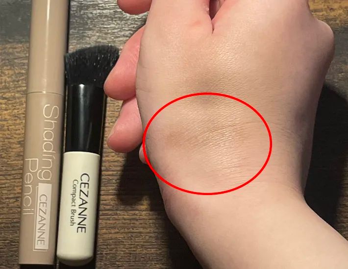 手の甲に『シェーディングペンシル』で線を引いてから、『コンパクトブラシ』でなぞると、かなり自然な影が作れました。