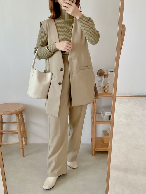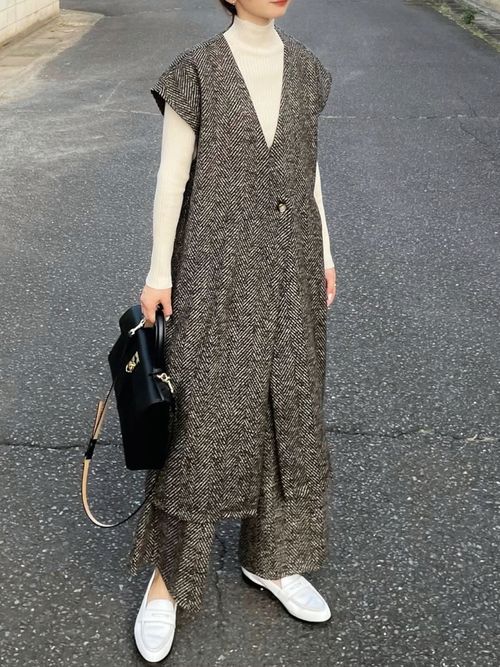 テイラードベストは引き続きトレンドのアイテムです。暑い時期は半袖Tシャツなどに羽織るコーディネートが人気でしたが、秋冬はブラウスやニット、ワンピースなどに重ねる人も。