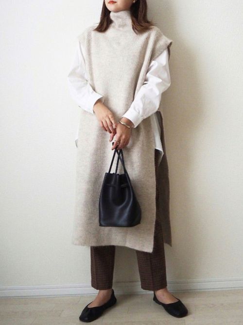 秋冬はぴったりしたサイズよりも少しゆったりしたオーバーサイズが主流。そのため、かぶるタイプのニットベストでは、あえて肩から落として着るような少し大きめのサイズ感のものも出ています。重ね着はもちろん、写真のようにノースリーブのトップスのようにも着られるので、季節の変わり目などにコーディネートの幅が広がります。