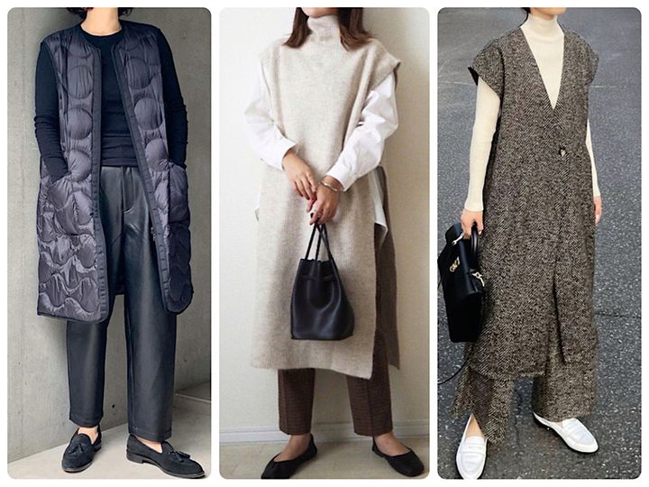 膝まであるロング丈ベストは着痩せして見える上にコート替わりにも 出典:WEAR