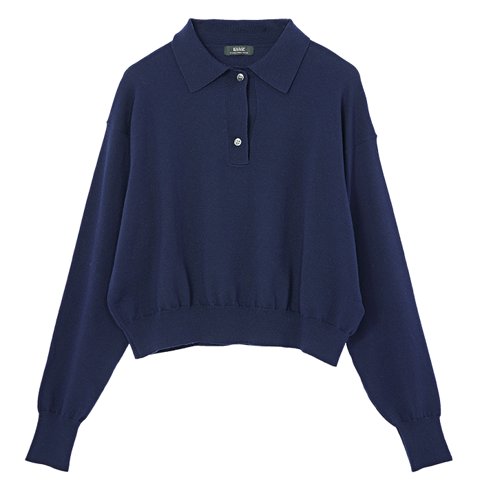 「やや短めの着丈がいい」。ネイビーポロニット¥19,250(ジャーナル スタンダード レサージュ/ジャーナル スタンダード レサージュ 銀座店)