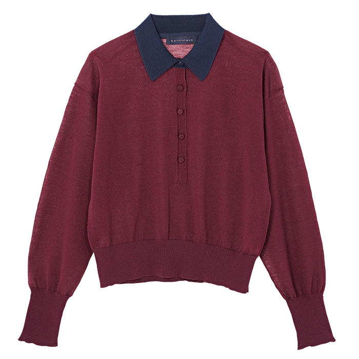 「色気のあるボルドーカラーが気になる! 大人にこそ着てほしい」。ボルドーポロニット¥31,900(マルティニーク/マルティニーク ルミネ横浜)