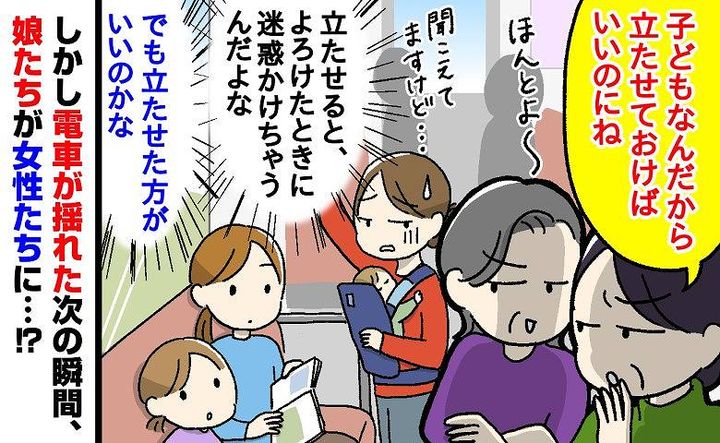「子どもは立たせておけばいいのにね」電車で聞こえてきた嫌味…すると電車が揺れて!?娘の一言で、女性は