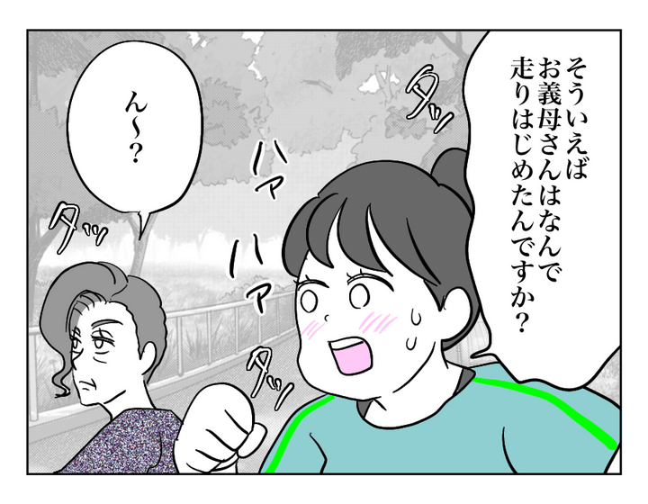 クミさんは一緒に走りながら、お義母さんにジョギングをはじめたきっかけを聞きます。健康的でいたかったからという理由はシンプルですが、思いついたことを実行するのってなかなか難しいですよね? きっとこうして毎日健康に気を付けていたら、お義母さんみたいに心もハツラツとしていられると思いますよ!