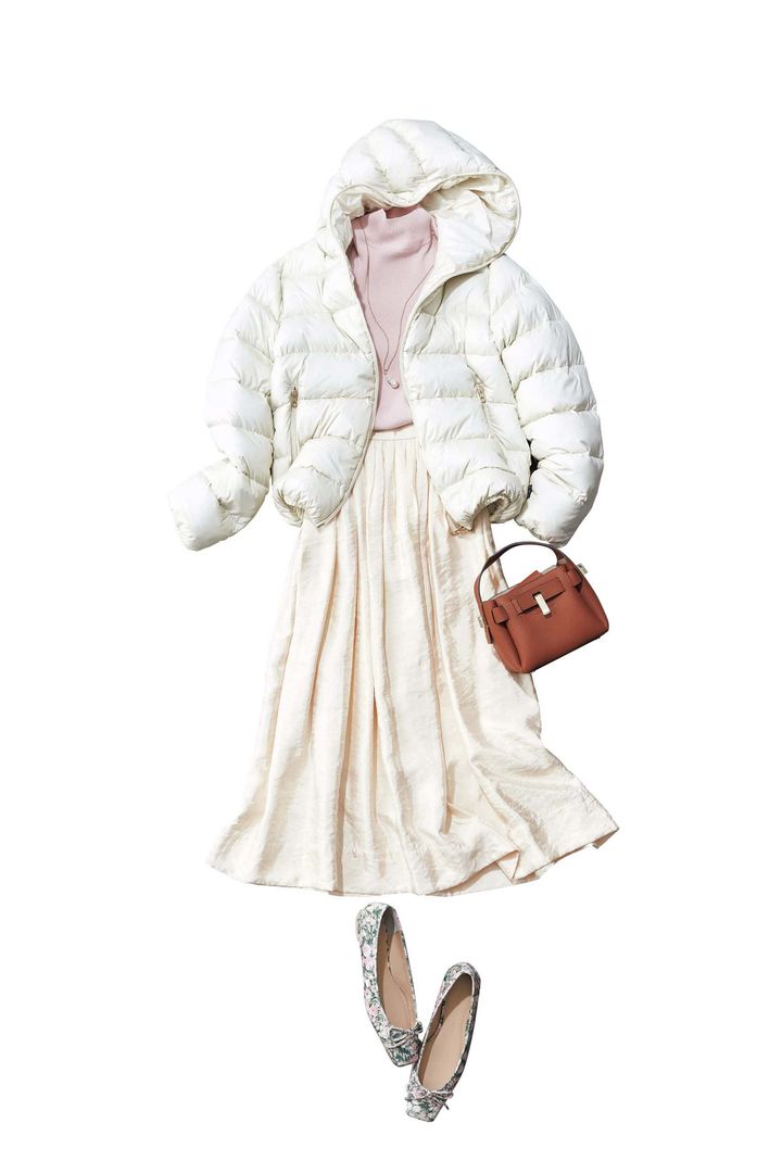 ホワイトダウンジャケット¥140,800(デュベティカ/F.E.N.)ピンクハイネックニット¥8,800(SNIDEL/SNIDEL ルミネ新宿2店)スカート¥27,500(マリリンムーン/マリリンムーンオンラインストア)バッグ¥42,900(PUNTI./エルディスト ショールーム)パンプス¥27,500(ツル バイ マリコ オイカワ)ネックレス¥28,600(インツーデザイン/ZUTTOHOLIC)